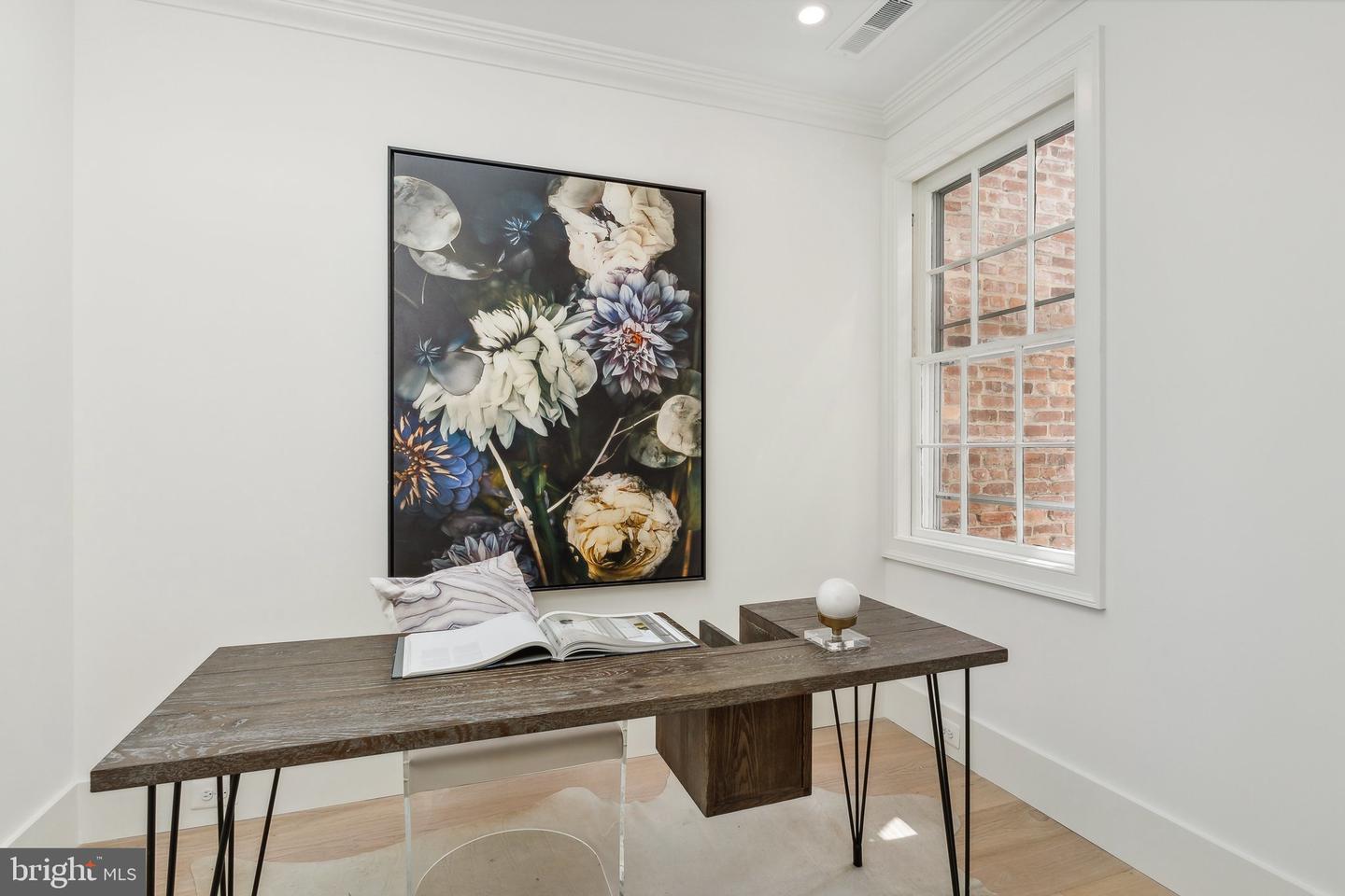 Charming Georgetown federal with exquisite, brand-new renovation by RG Custom Builders, finished with bespoke interior design by Edith Gregson Interiors. This three-story residence boasts 3 Bedrooms, 3.5 Bathrooms and over 2,300 square feet of living space flooded with an abundance of natural light and luxury finishes. Step inside to discover the high coffered ceilings, White Oak hardwood floors, gourmet Kitchen with custom Taj Mahal Quartzite Kitchen counters and backsplash, Shiloh Inset custom cabinetry, and top-of-the-line Fratelli Bertazzoni Kitchen appliances. The Main Level features an open concept floorplan offering a gracious formal Living Room with gas fireplace and DreamCast artisan concrete mantel, a formal Dining Room, luxury Kitchen, Powder Room and a bonus Sitting Room with gorgeous floor-to-ceiling French doors. Retreat outdoors to your very own, serene private garden with hardscape patio - the perfect oasis for entertaining or relaxing after a long day. The spacious Upper-Level features 2 generous Bedrooms, 2 full Bathrooms and an additional room perfect for a home office or nursery. The Lower-Level presents versatile possibilities with the 3rd Bedroom and full Bathroom, perfect for an au pair or guest suite. Located along a charming, private enclave of Georgetown's East Village that is highly sought-after for its tranquility and close proximity to Rose Park. This meticulously upgraded home seamlessly blends historic charm with modern amenities for the ultimate Georgetown living.